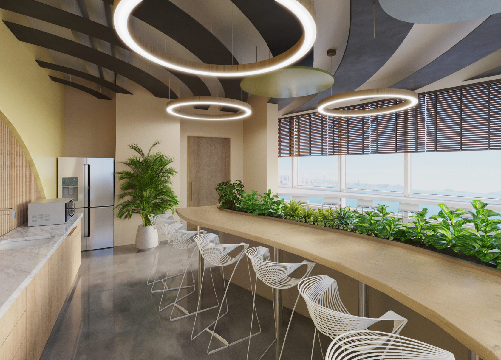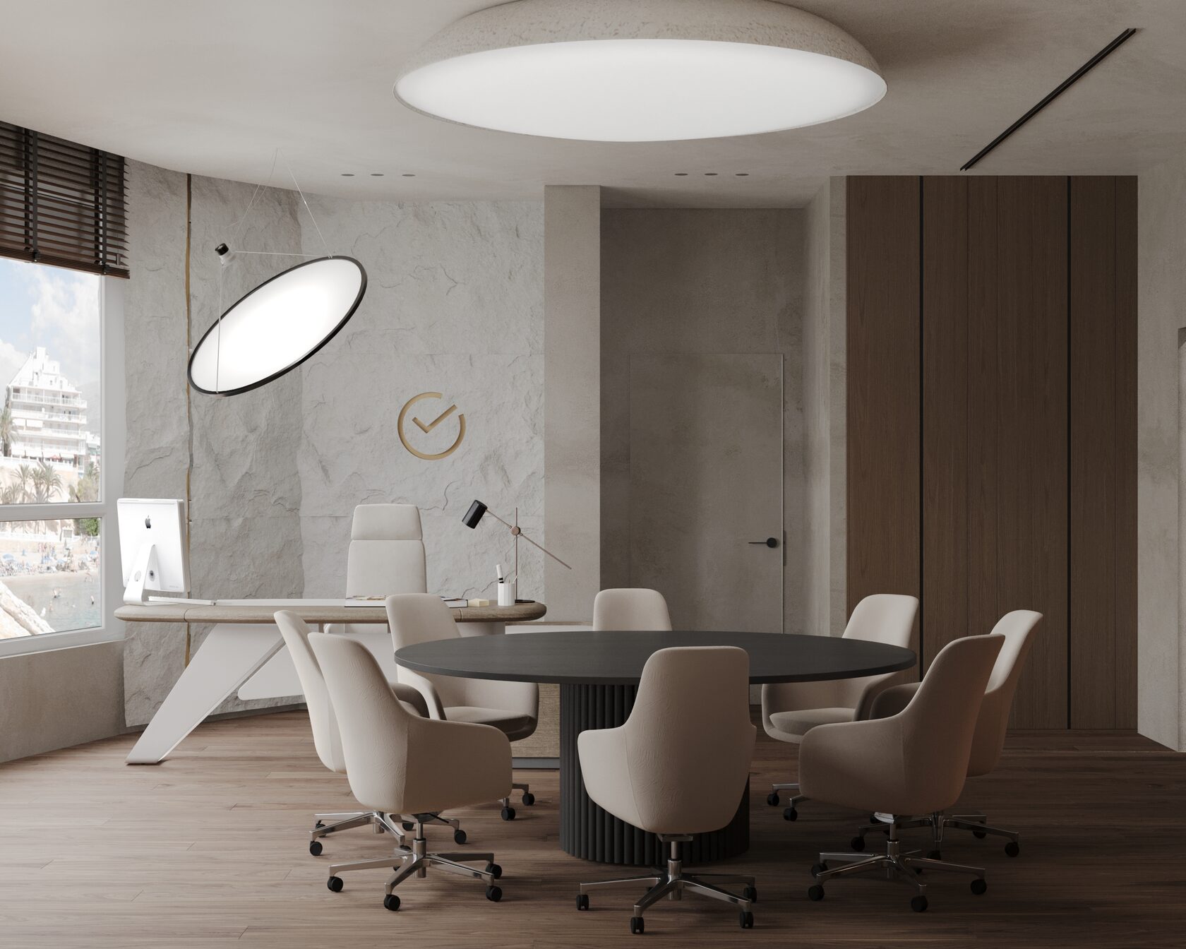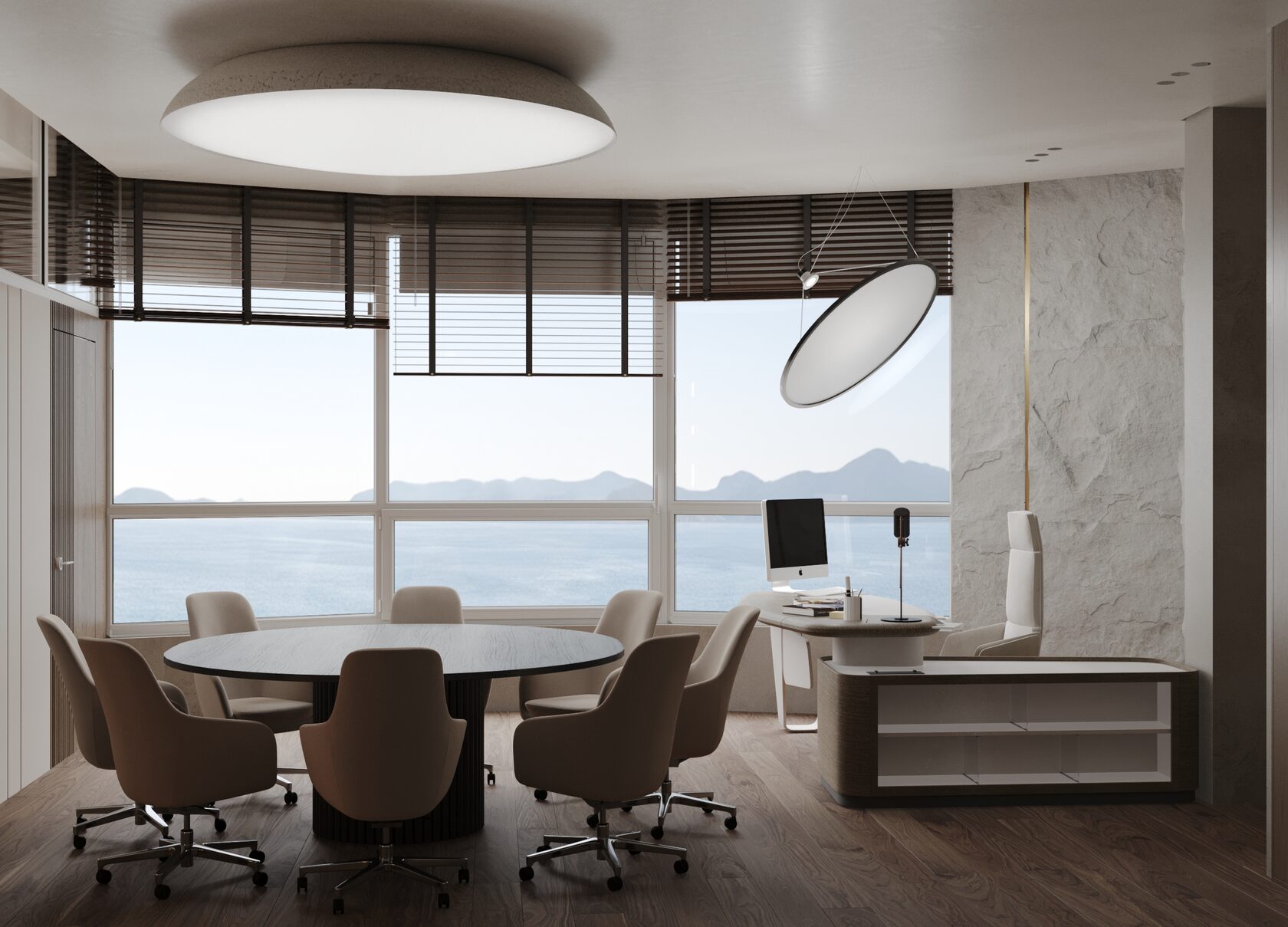 С удовольствием разработали дизайн интерьера для офиса Сбербанка во Владивостоке, председательский этаж. Задача была сделать интерьер представительным и современным. Концепция интерьера воплощает в себе тему востока и природы. Поэтому были использованы природные материалы и округлые формы.