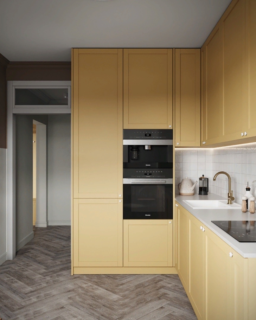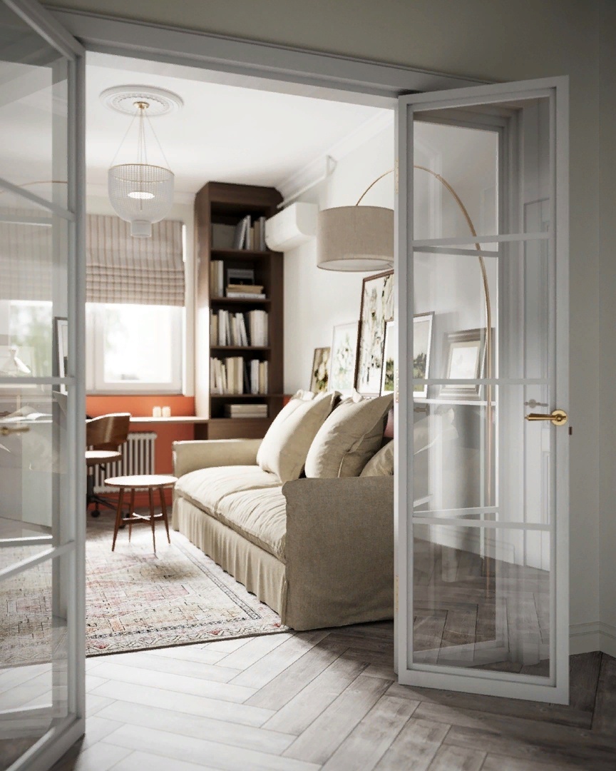— На кухне сделали стеклянную фрамугу, которая подошла по стилю. Дверь на кухню решили убрать, т.к. заказчица любит приглашать гостей за стол и хочет, чтобы вкусный запах разносился по всей квартире, призывая всех к столу. Именно поэтому сделали гостинную ближе к кухне.